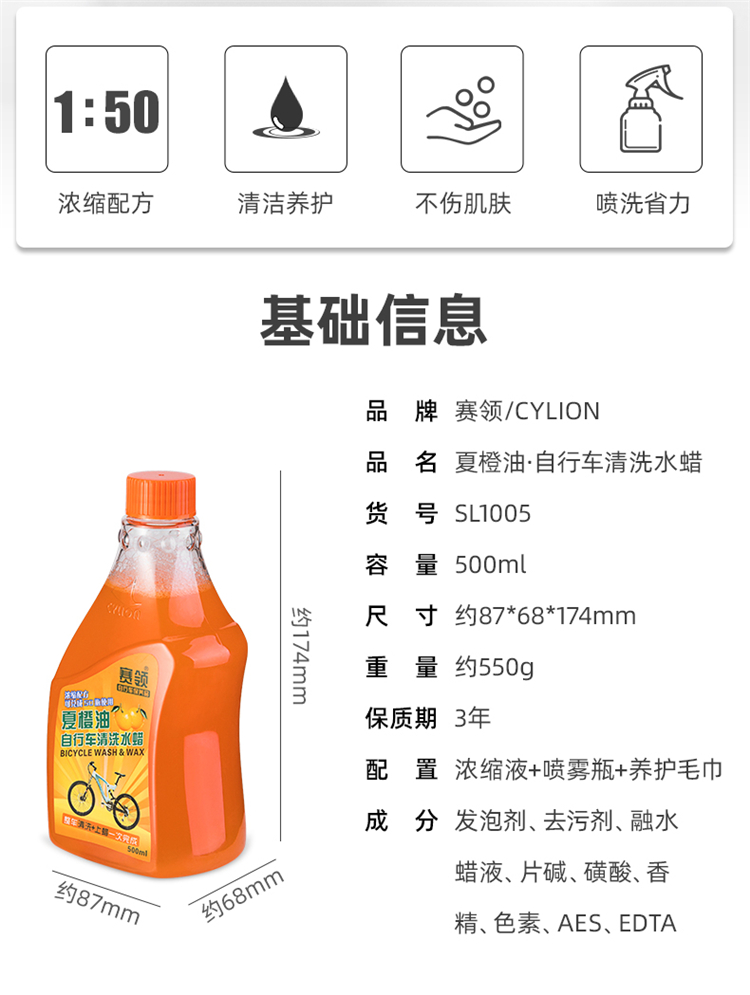 商品名称:赛领夏橙油山地公路折叠自行车清洗液水蜡车身漆面清洁保养护喷剂