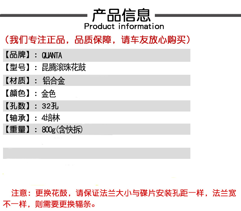 商品名称:台湾昆腾碟刹山地车滚珠花鼓自行车32孔单前后滚珠花鼓快拆轴承