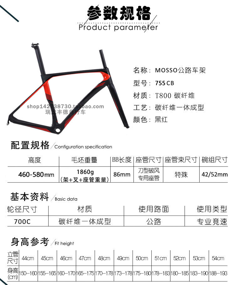 MOSSO峰大755CB公路跑车自行车车架碳纤维超轻公路赛700C车架DIY
