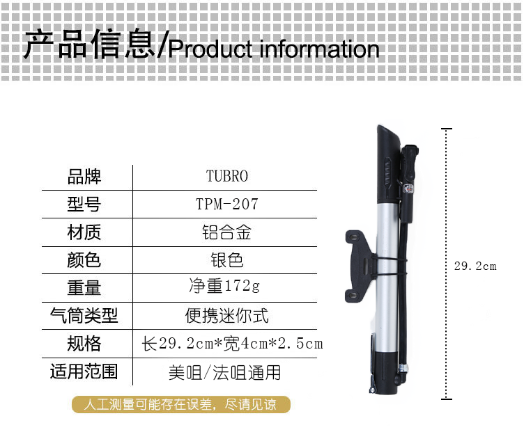TUBRO途客便携式自行车打气筒家用轻便气压表打气筒美咀法咀通TPM207