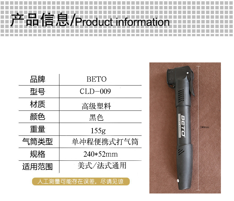 BETO便携式自行车打气筒单冲程双气咀山地公路车折叠车气筒CLD009